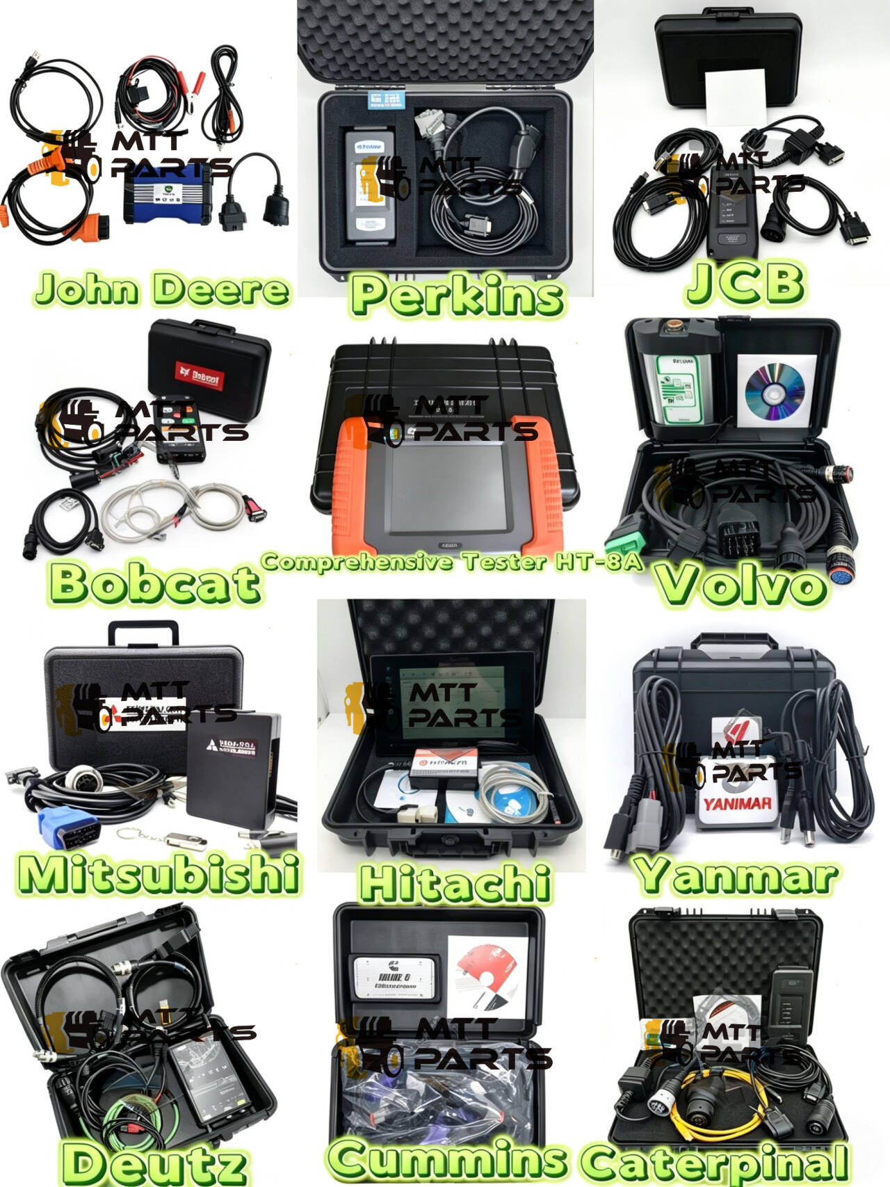 Yang menonjol adalah betapa praktisnya tampilannya. Tidak ada alat umum yang mungkin berfungsi setengah-setengah; ini adalah pengaturan khusus merek yang terhubung dengan benar dan memberi Anda data yang benar-benar Anda perlukan. Bahkan ada penguji lengkap lengkap (HT-8A) yang ditampilkan di tengah, ditambah opsi untuk merek yang agak sulit menemukan diagnostik yang baik, seperti Yanmar atau Bobcat.